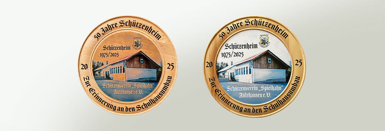 Schützenscheibe oder Ehrenscheibe aus Rotbuche.Schützenscheibe bedruckt durch UV-Direktdruck